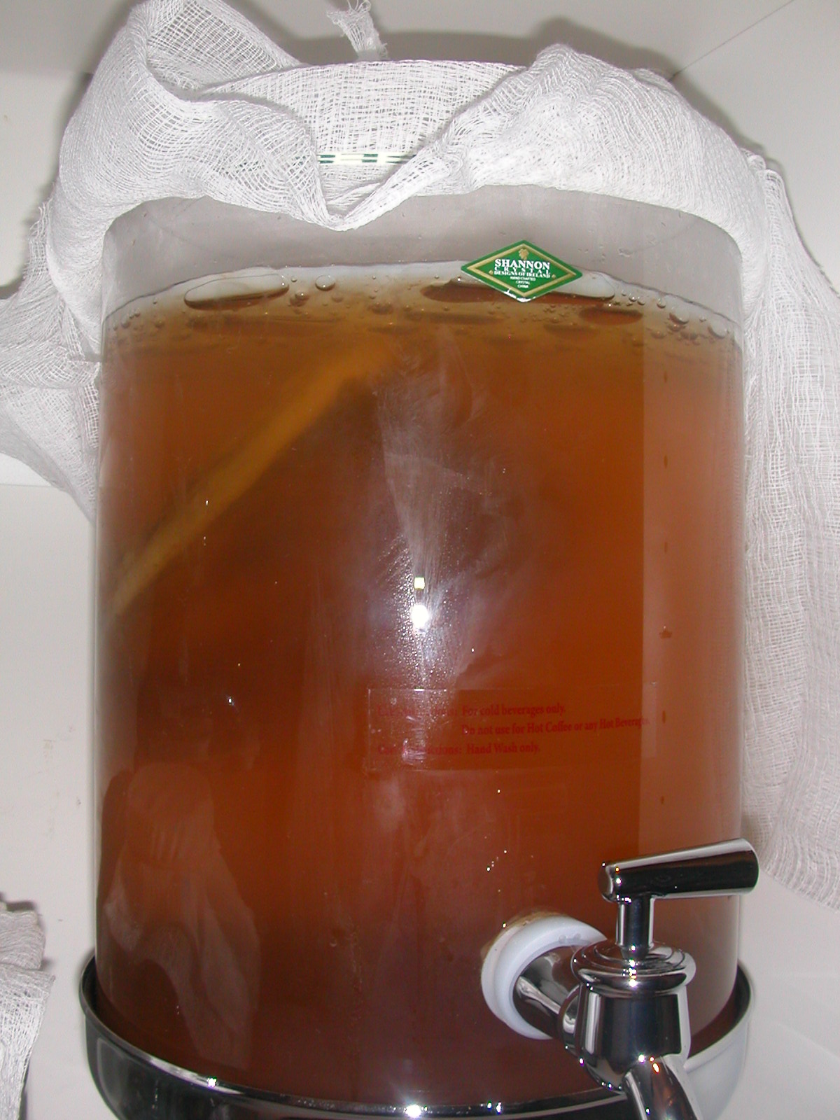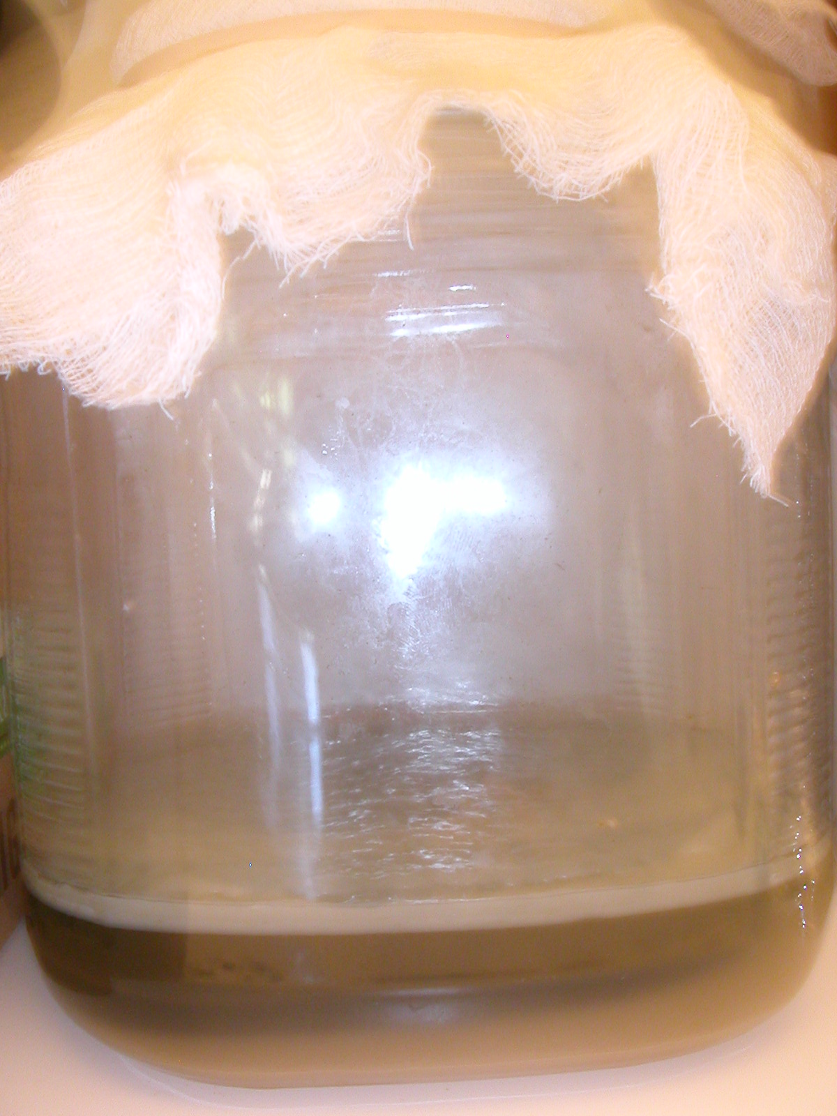 | Kombucha Mother SCOBY Rising and baby SCOBY forming on top |