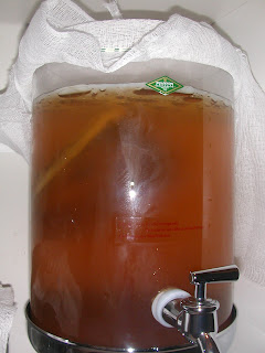 My reserve Kombucha has been brewing for 3 weeks and is forming a new SCOBY. My 2.5 Gallon Batch of Kombucha has been fermenting for 1 week. Thus far, a baby SCOBY is forming on top, slightly different than my original SCOBY because it is fermenting so carbonation is occuring, leaving tons of big and small bubbles resting under the growing baby SCOBY. My mother SCOBY has begun to rise from the bottom of the container to the top. this indicates that the Green tea is fermenting properly. It should only be a week more before my batch is ready to bottle and I'll have 2 SCOBYs to brew more batches, (plus a third that is growing from my reserve Kombucha). I cannot wait to begin to bottle and flavor the Kombucha, I was thinking of squeezing my own fruit juice to flavor and adding Chollera and blue green algae for added benefits. Luckily, Whole Foods is having another sale on KeVita probiotic drink 2/$4 or a case (12 for $21) so I am able to not spend too much money to keep my once a day probiotic drink regime in order. Here are some pictures!